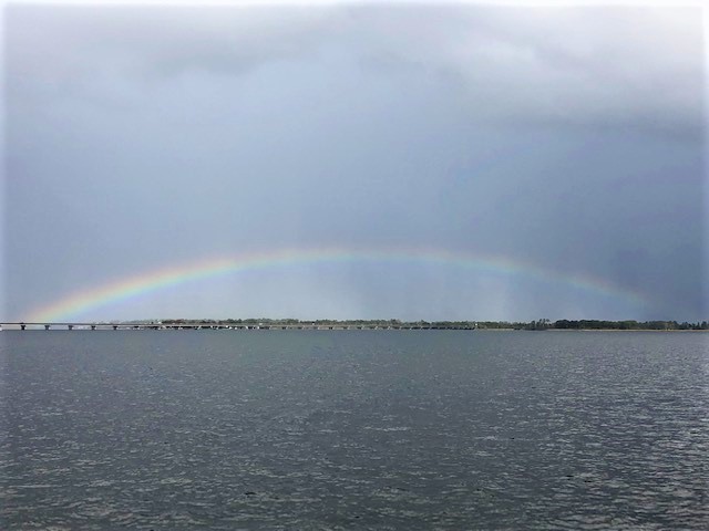 Of course, as we're approaching New Bern the skies are getting darker and we can see areas of rainfall ahead. Buttoned down everything on the flybridge and figured for sure we would be docking in a mess. Unbelievably, the rain passed, the wind died down and we saw multiple rainbows and a possible water spout while waiting for the 2:30 bridge opening.